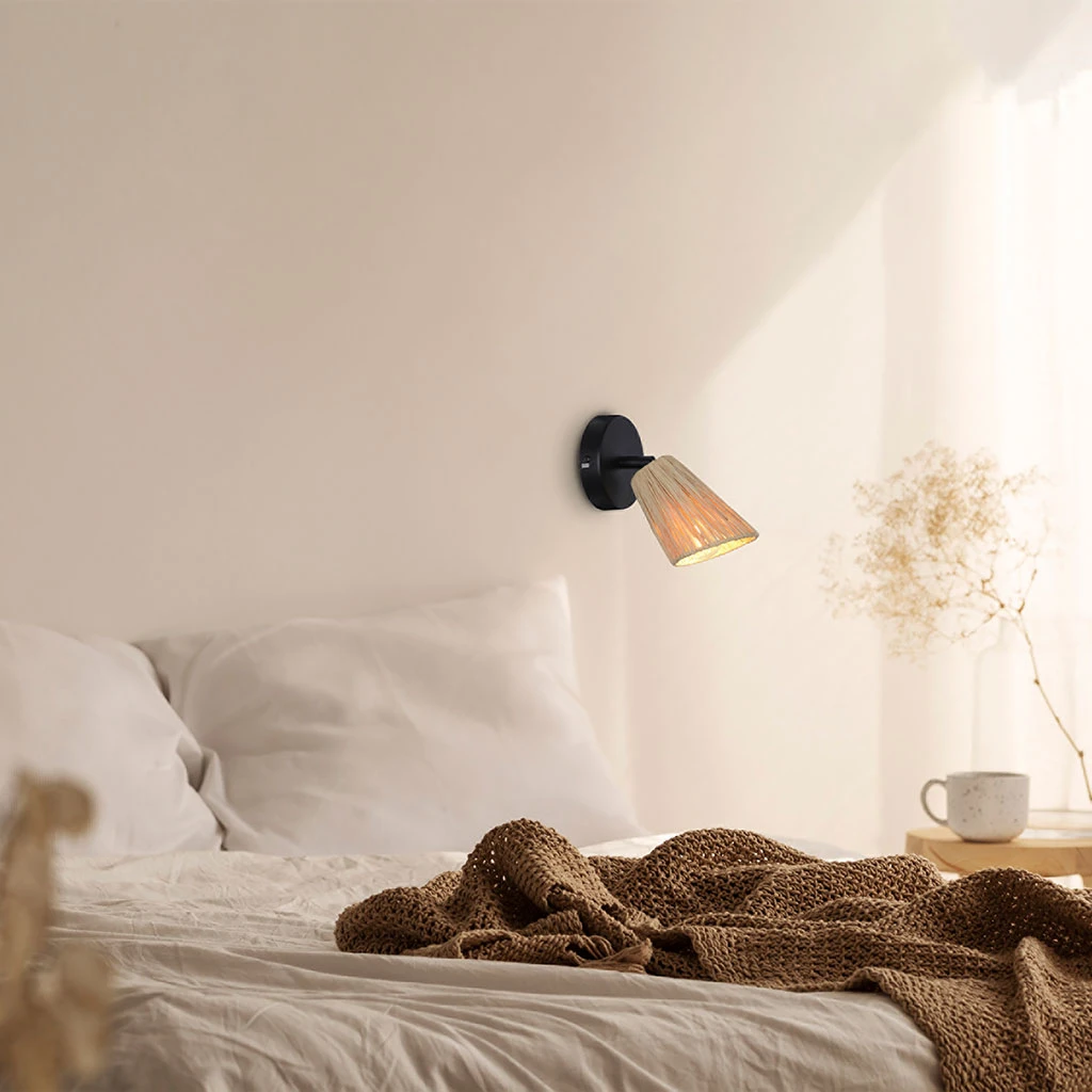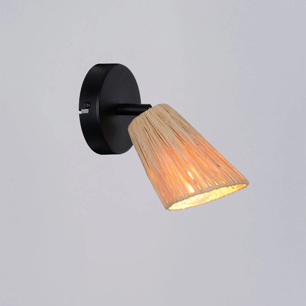 Spot 1 lumière base en métal peint. Abat-jour forme conique en raphia tressé à la main. Tête orientable. Coloris : naturel. IP20. L10cm – P14cm – H16.5cm. Classe 2. E14-15W.