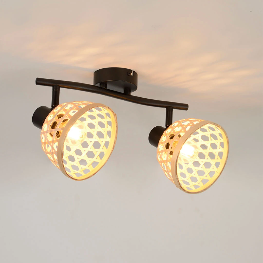 Spot 2 lumières base métal, abat-jour forme dôme en bambou tressé.