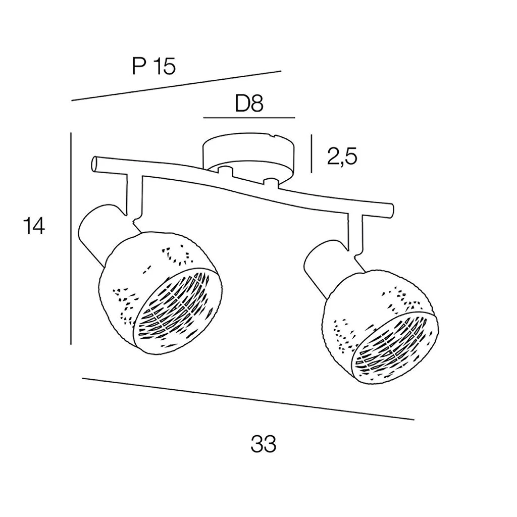 Spot 2 lumières base métal, têtes articulées forme boule en rotin tressé à la main. Coloris : naturel. IP20. L33cm – H14cm – P15cm. Classe 1. E14-40W.
