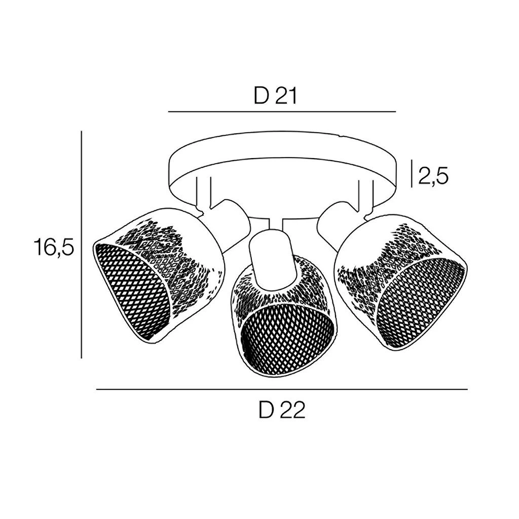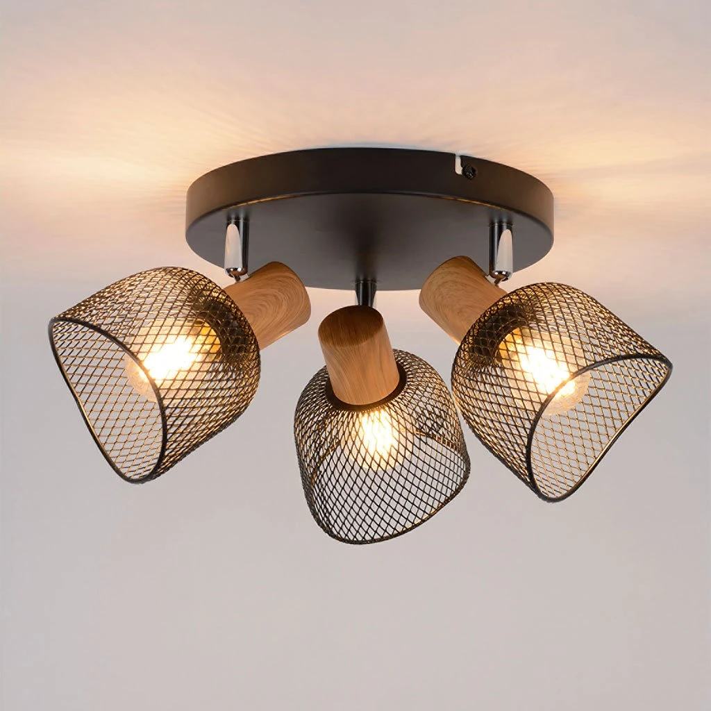 Plafonnier 3 lumières base ronde en métal et finition effet bois. Abat-jour en métal grillagé peint. Têtes orientables. Coloris : blanc. IP20. H16,5cm-D22cm. Classe 1. E14-25W.