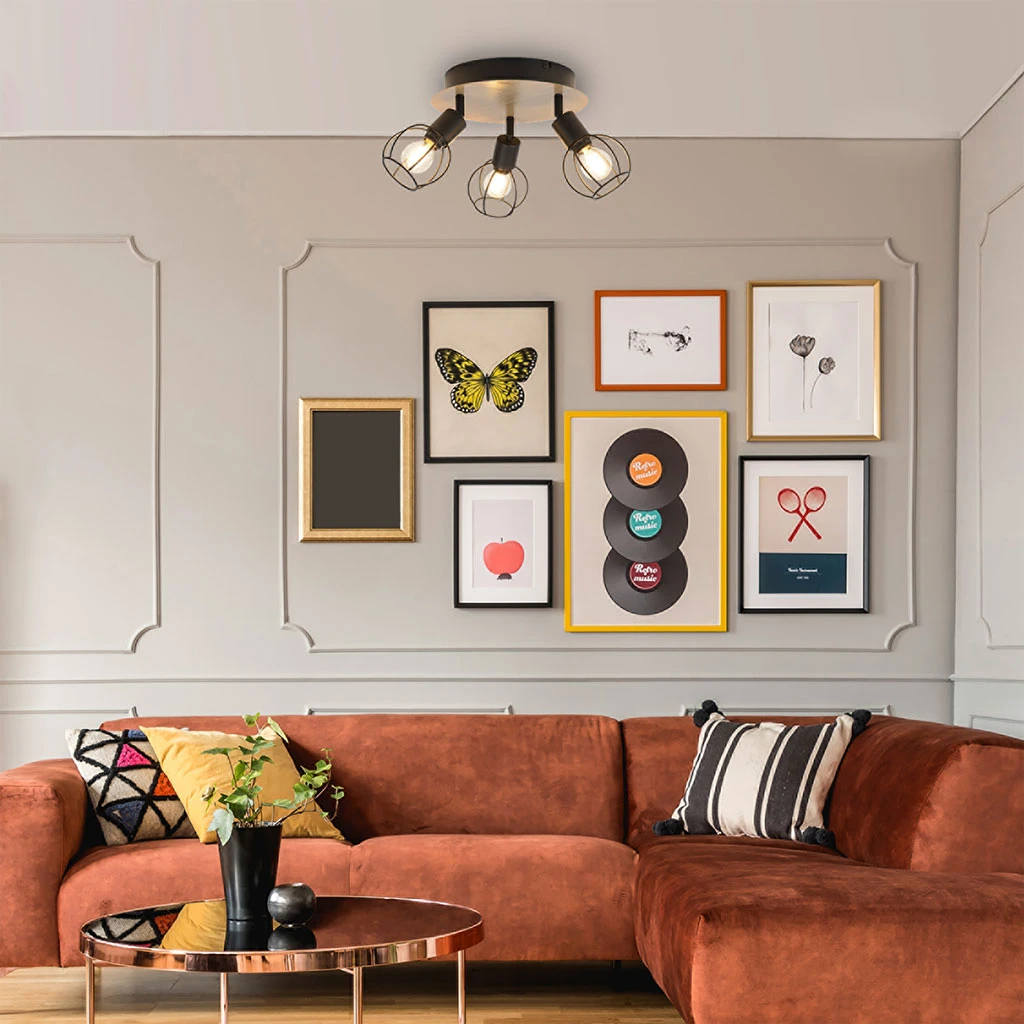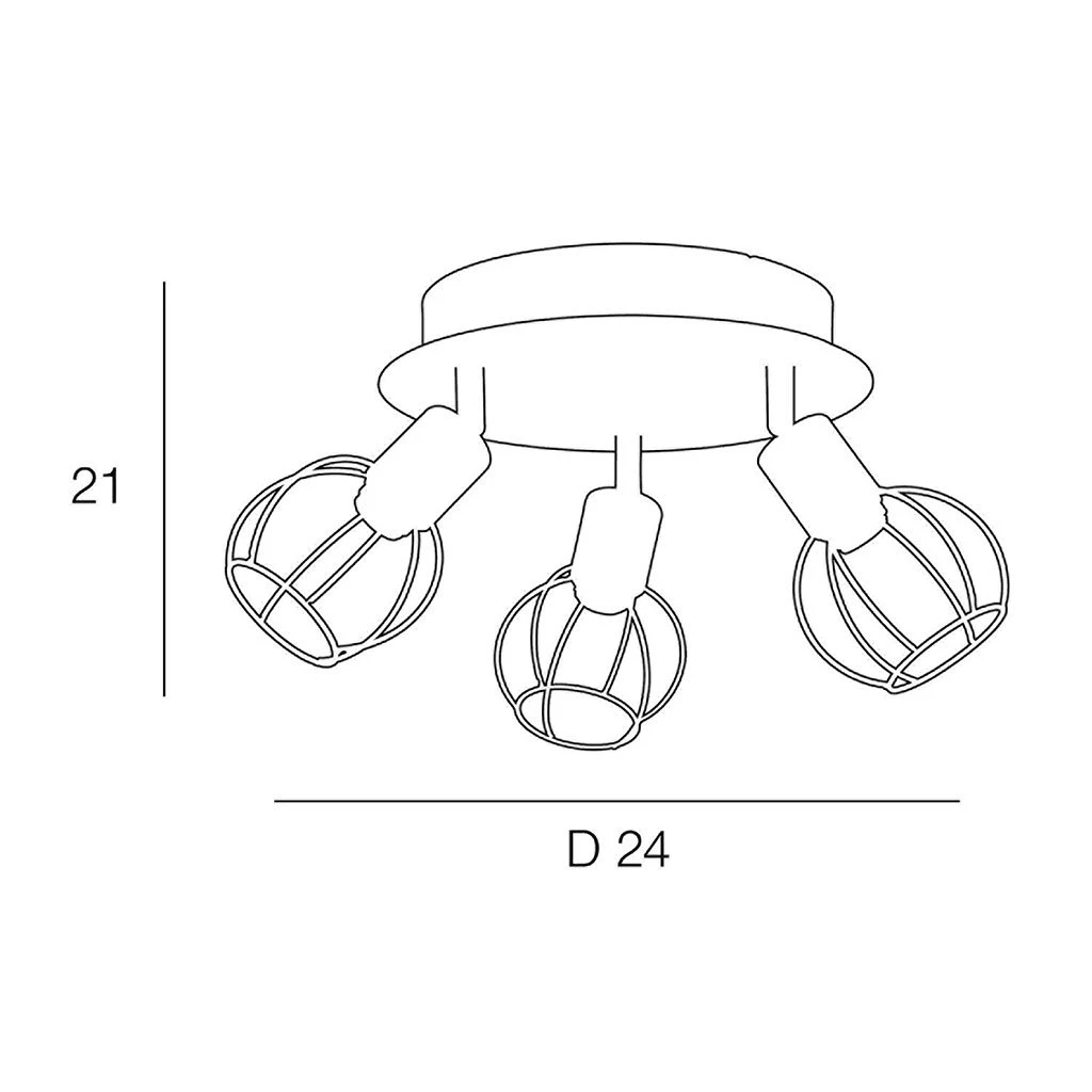 Spot 3 lumières base ronde en métal peint. Abat-jour en métal filaire peint. Têtes orientables. Coloris : noir/naturel. IP20. D24cm – H21cm. Classe 1. E14-40W.