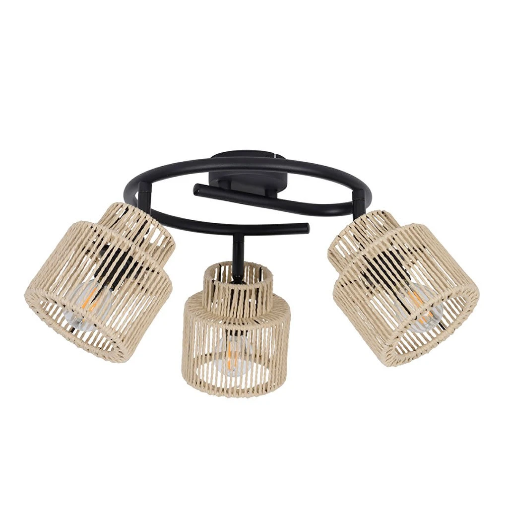 Spot plafonnier 3 lumières base métal et têtes articulées en cordelette de papier tressée à la main. Coloris : naturel. IP20. D47cm – H22cm. Classe 1. E14-40W.