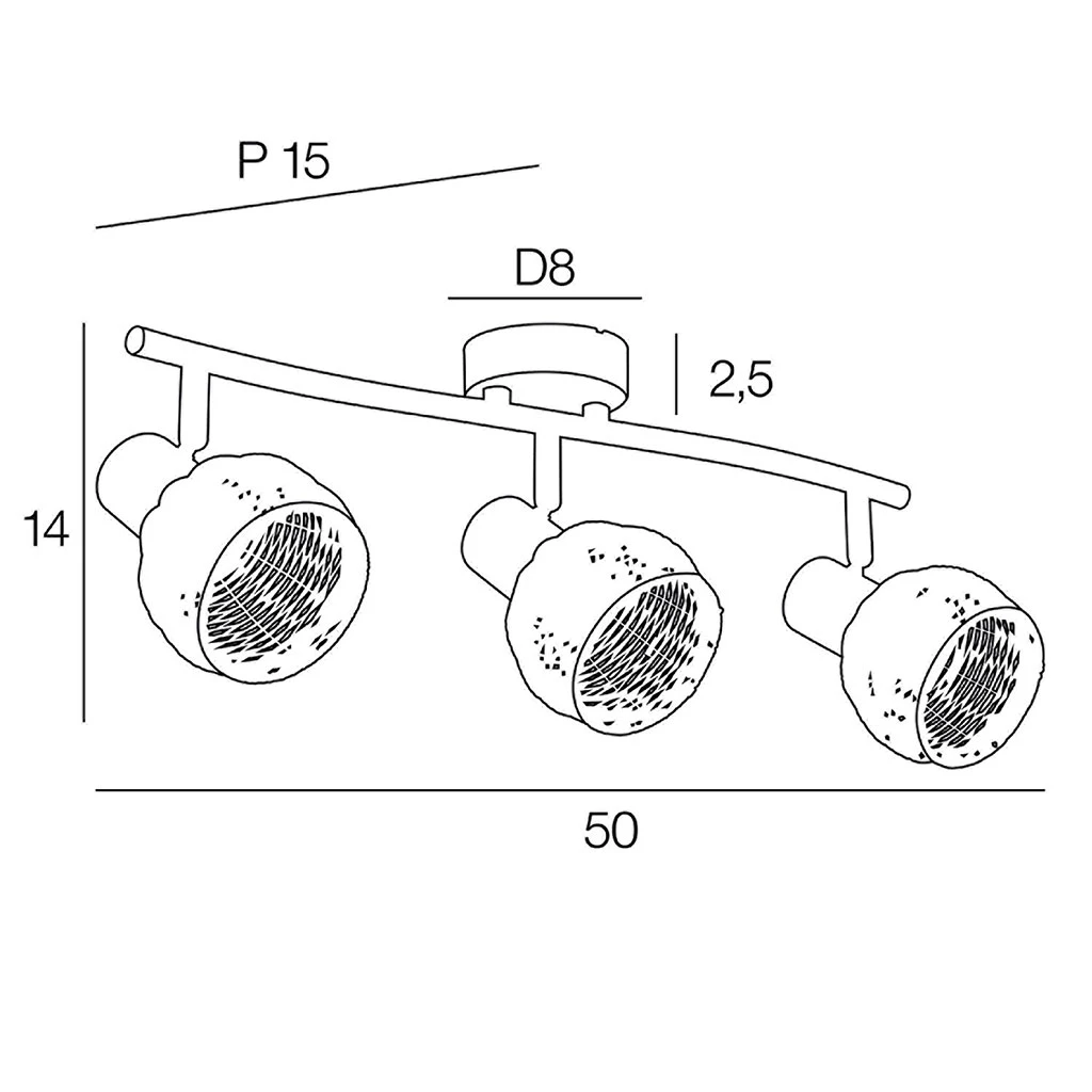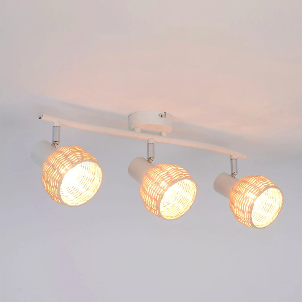 Spot 3 lumières base métal, têtes articulées forme boule en rotin tressé à la main. Coloris : naturel. IP20. L50cm – H14cm – P15cm. Classe 1. E14-40W.