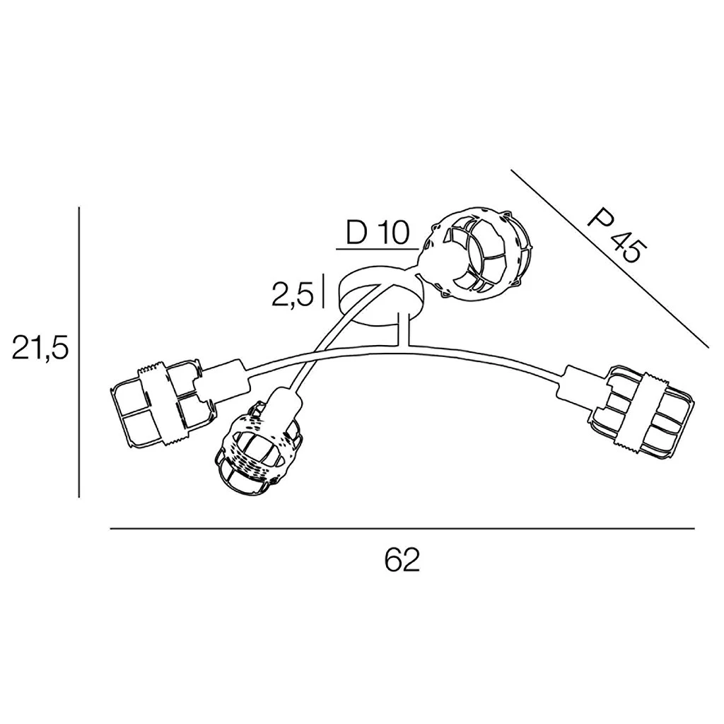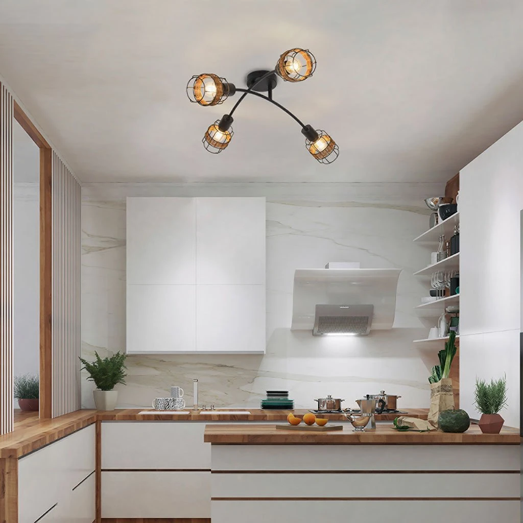 Plafonnier 4 lumières base ronde en métal. Abat-jour en métal filaire et rotin. Cache douille en métal. Bras articulés. Coloris : brun. IP20. L62cm – P45cm – H21.5cm. Classe 1. E14-40W.