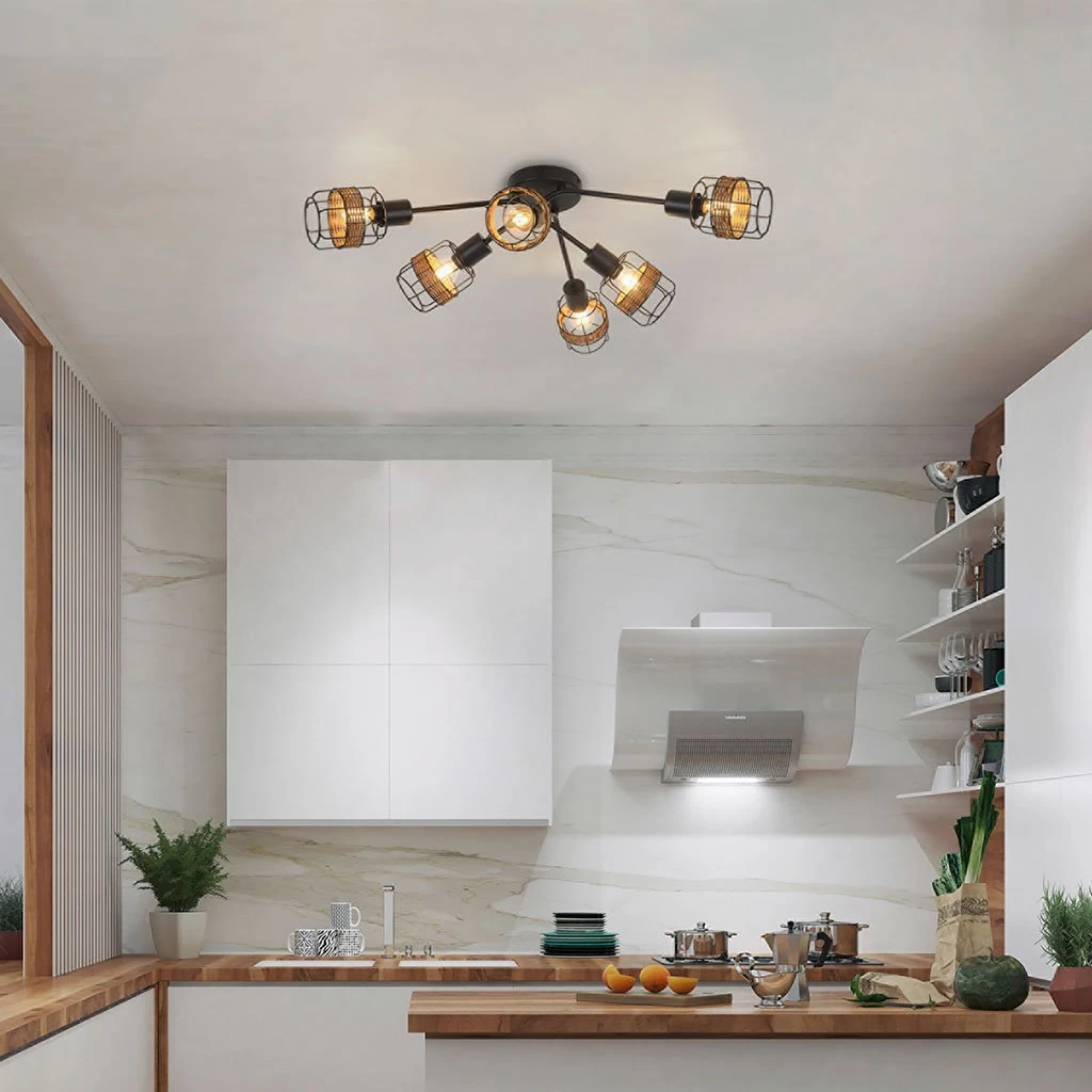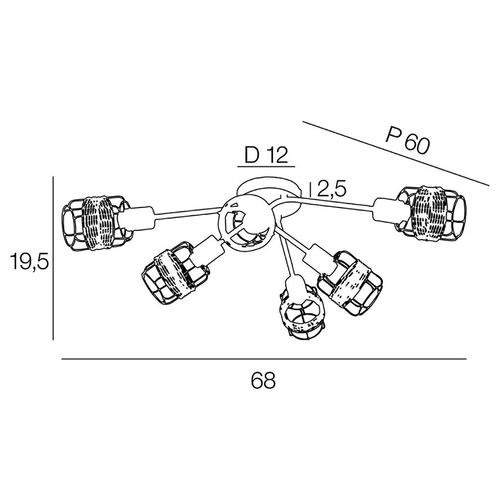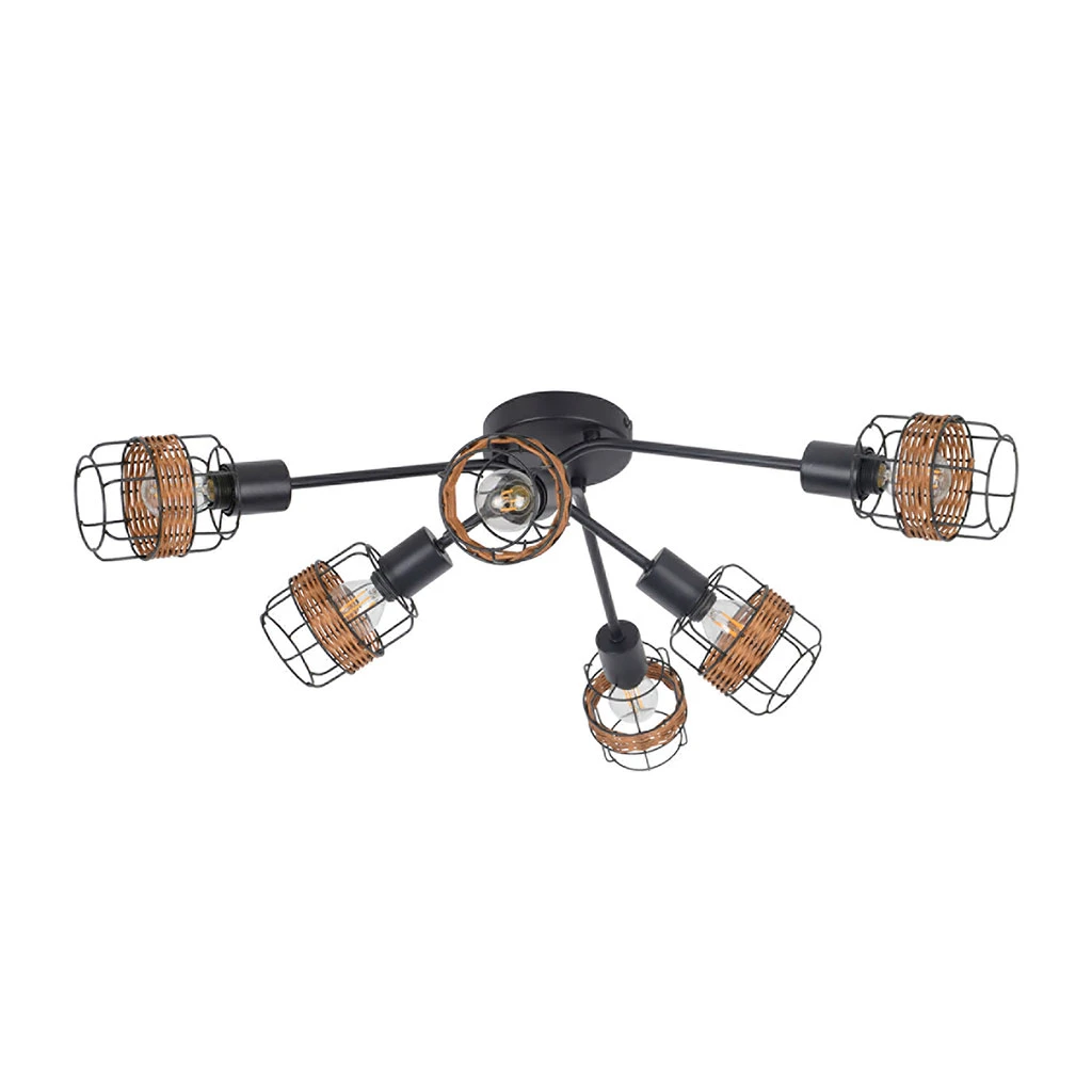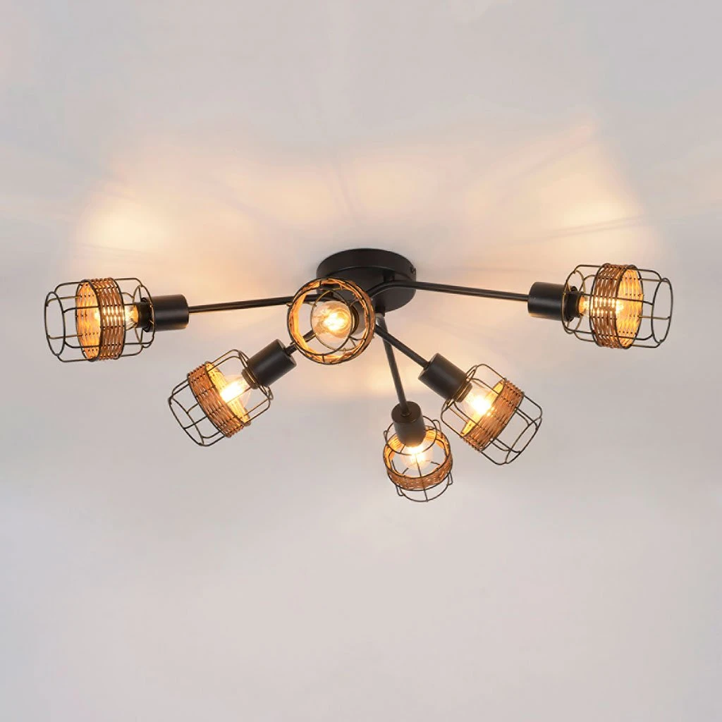 Plafonnier 6 lumières base ronde en métal. Abat-jour en métal filaire et rotin. Cache douille en métal. Bras articulés. Coloris : brun. IP20. L68cm – P60cm – H19.5cm. Classe 1. E14-40W.