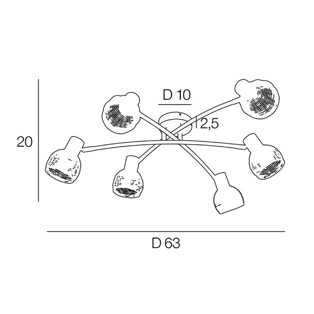 Plafonnier 6 lumières base métal, têtes articulées forme boule en rotin tressé à la main. Bras articulés. Coloris : naturel. IP20. D63cm – H20cm. Classe 1. E14-40W.