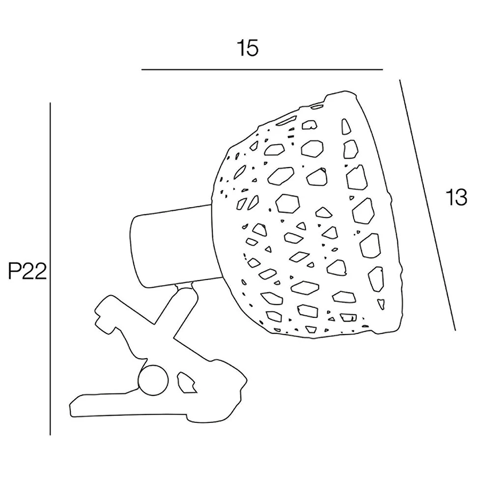Spot à pince base en métal peint avec abat-jour en rotin. Tête articulée et pince en plastique. IP20. H15cm-L13cm-P22cm. Classe 2. E14-40W.