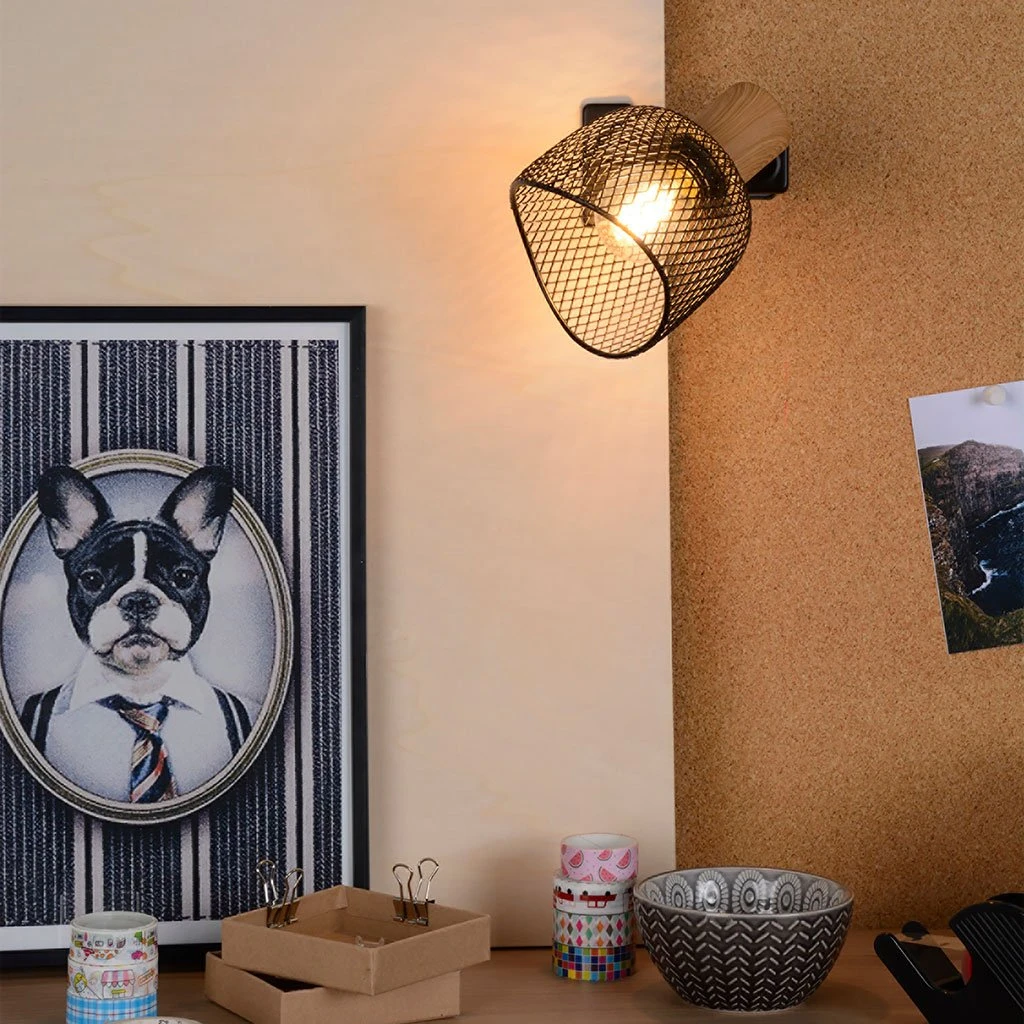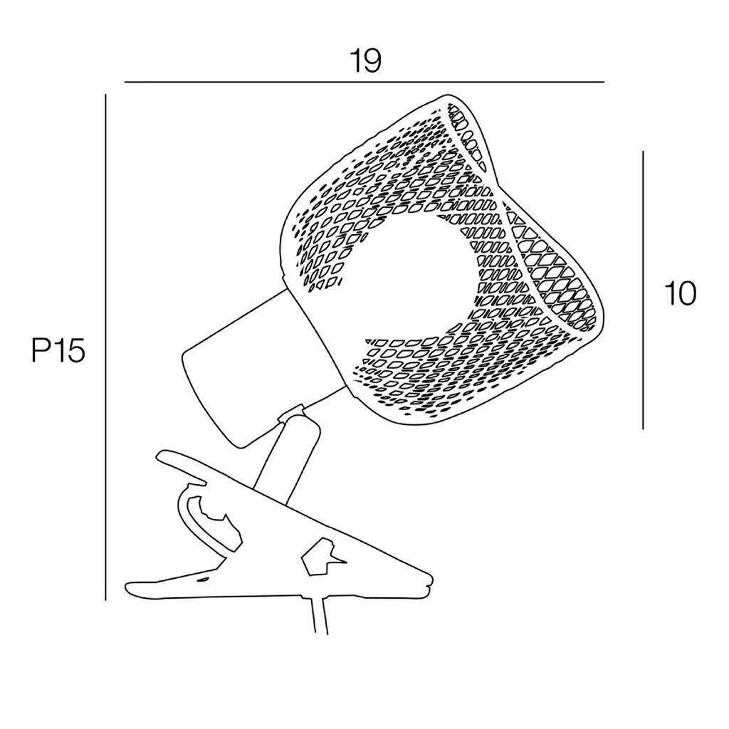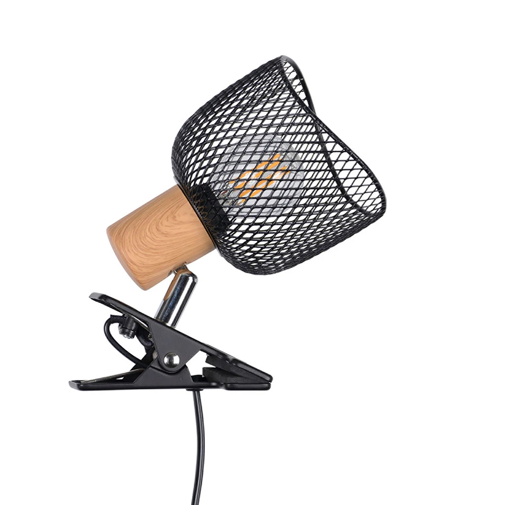 Spot à pince base métal avec abat-jour en métal grillagé peint et finition effet bois. Tête articulée et pince en plastique. Coloris : noir. IP20. H19cm-L10cm-P15cm. Classe 2. E14-25W.