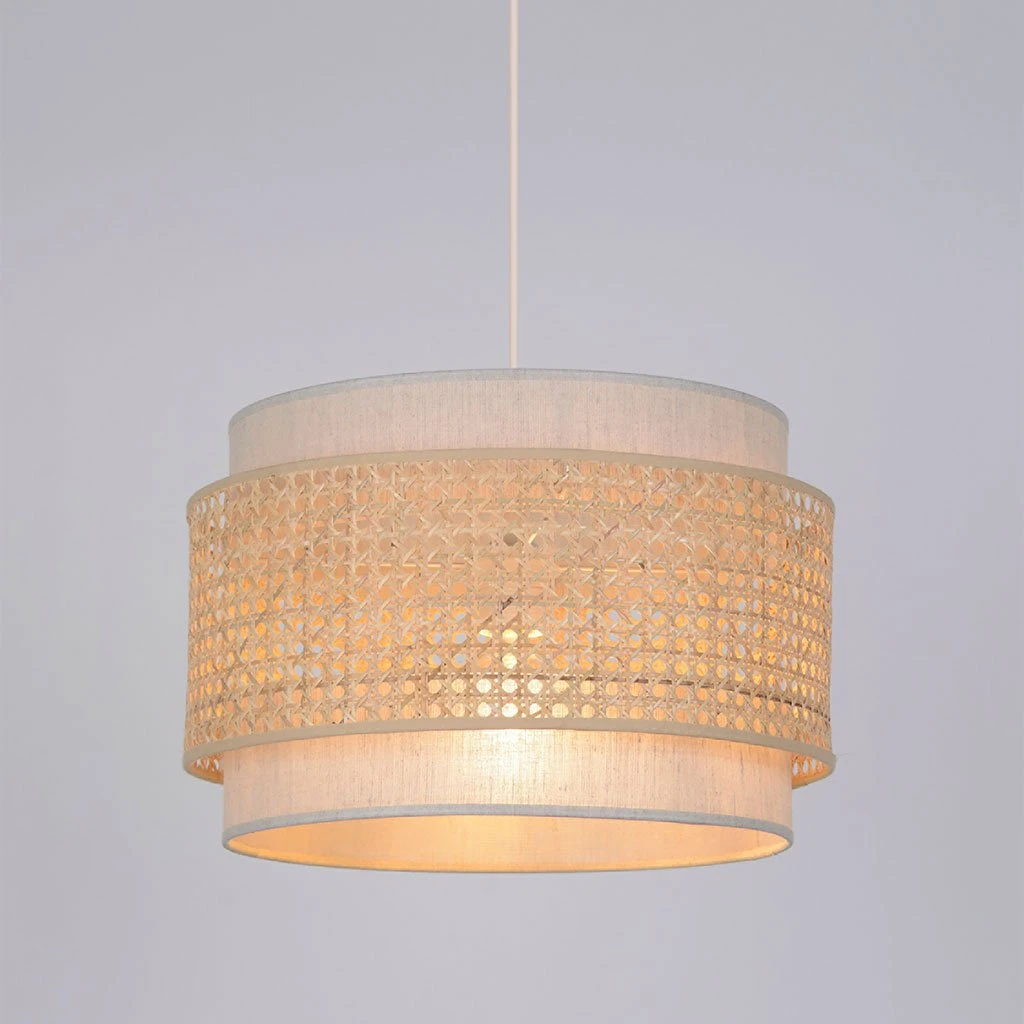 Suspension empilement de 3 cylindres en cannage et coton. Coloris : cannage/pyla IP20. D38cm – H25cm – HT118cm. Classe 2. E27-100W.