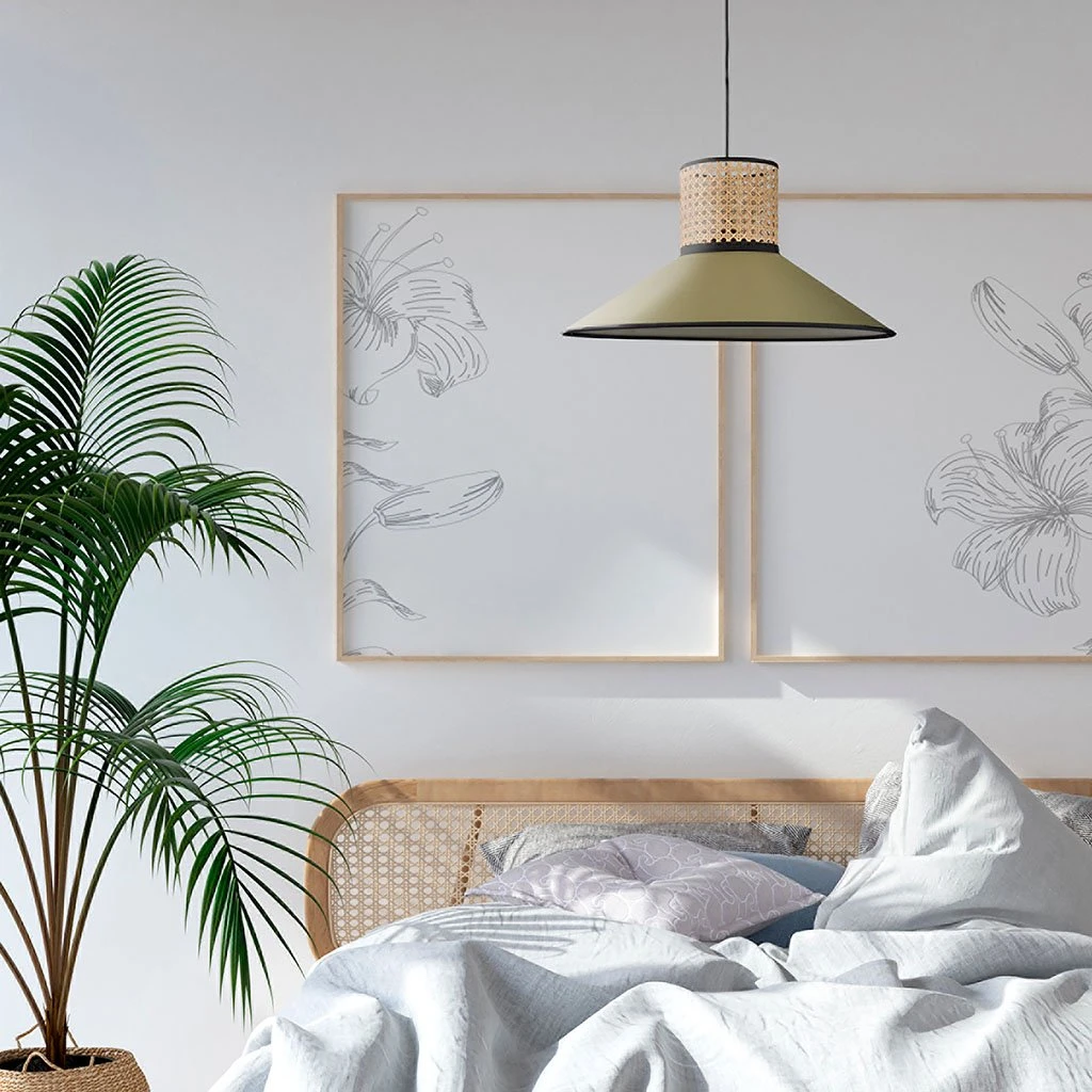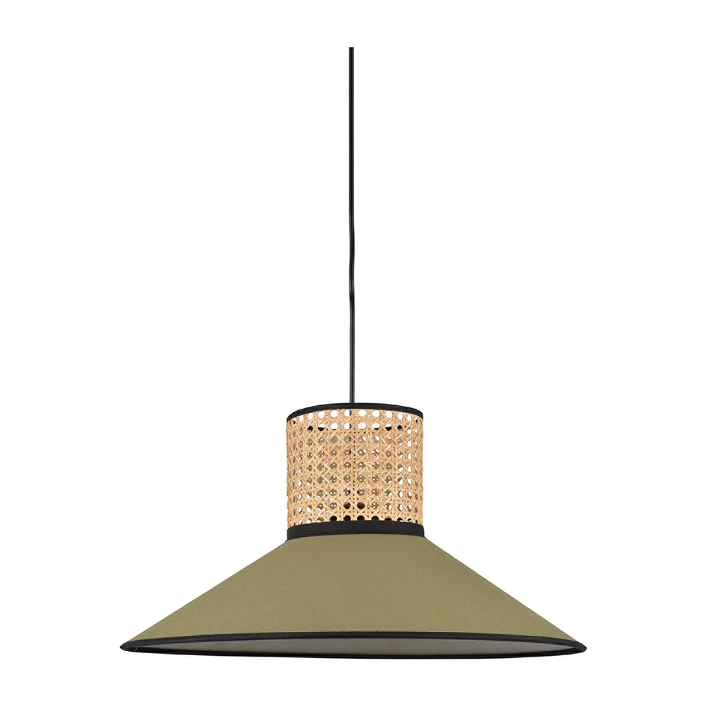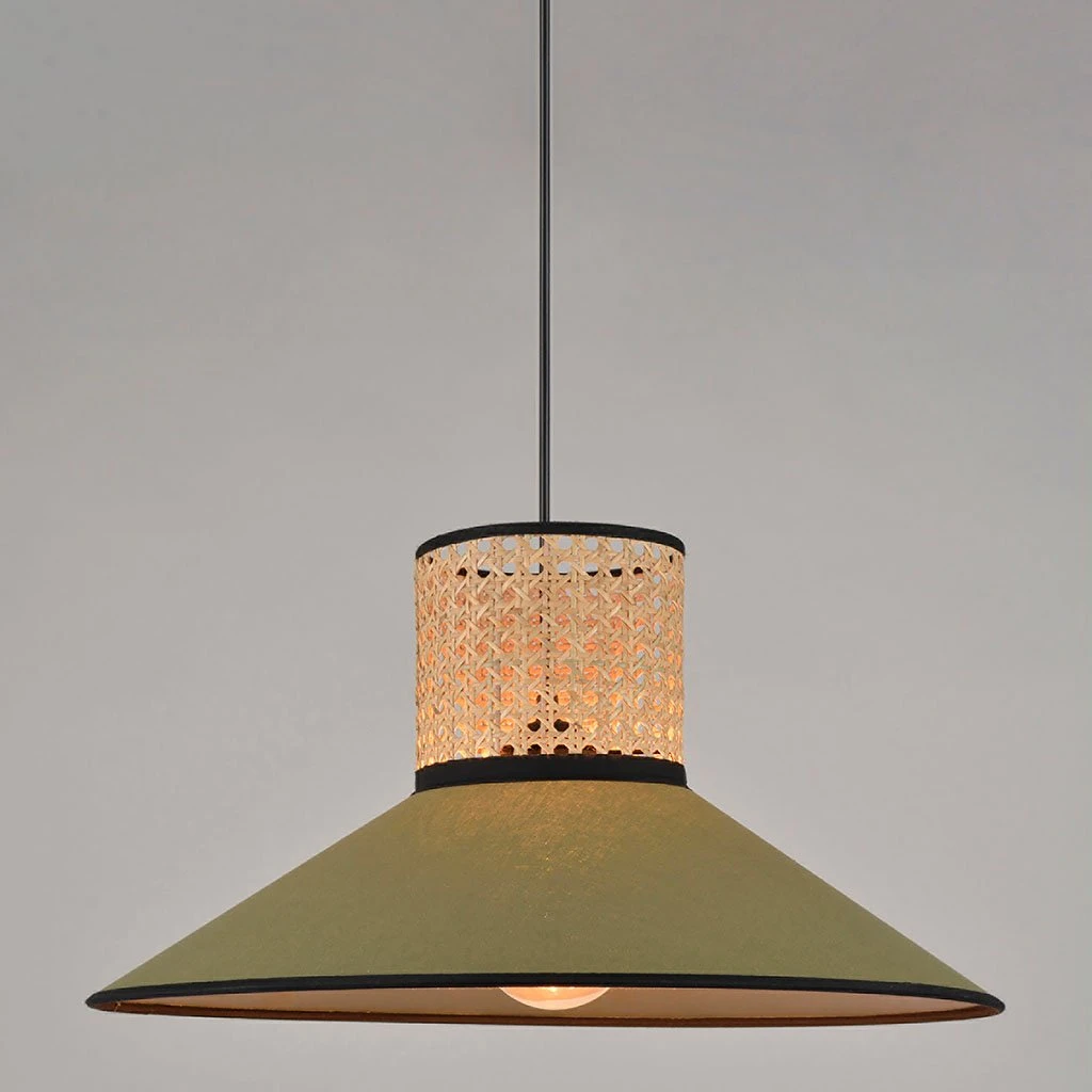 Suspension conique bi-matière en coton et cannage.