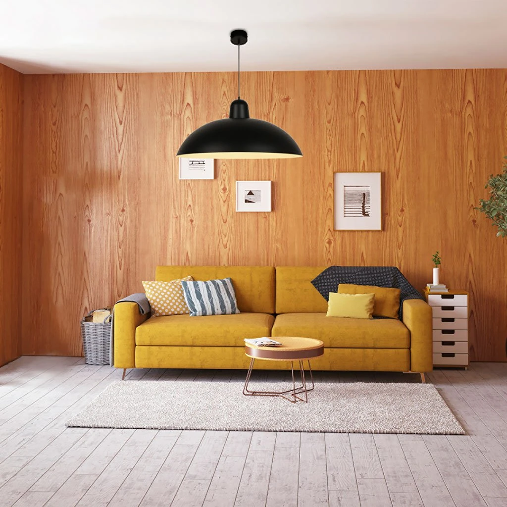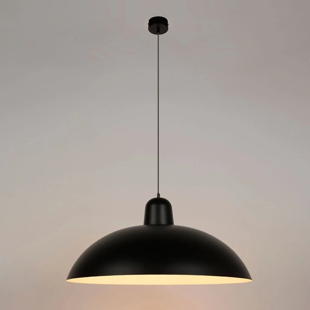 Suspension forme dôme, style années 50, en métal peint avec partie haute en métal. Équipée d’un pavillon adaptable DCL. Coloris : noir. IP20. D78cm – H35cm – HT115m. E27-60W.