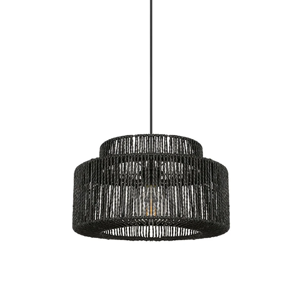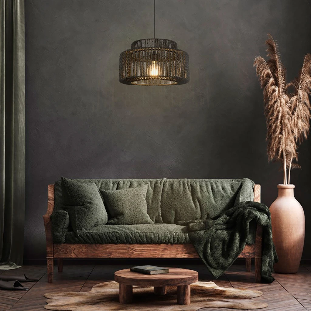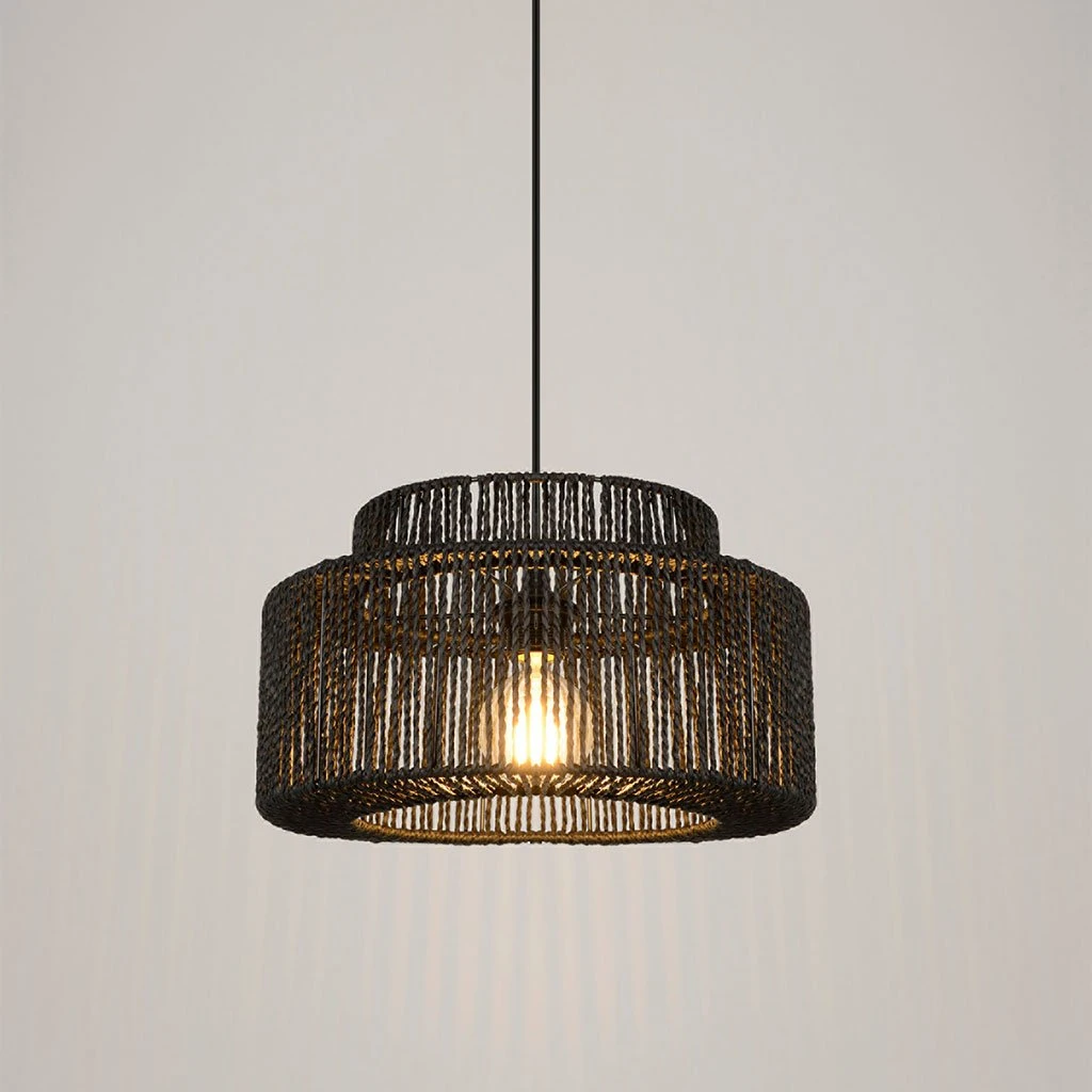 Suspension forme cylindre en cordelette de papier tressé. Coloris : noir. IP20. Coloris : naturel. IP20. D38cm – H22cm. Classe 2. E27-60W.