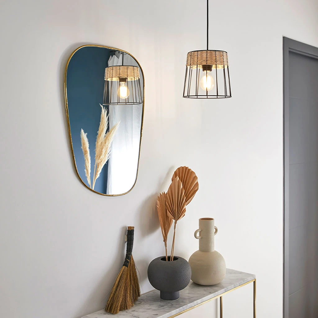 Suspension forme tambour, en métal filaire peint et finition en rotin tressé. Coloris : noir. IP20. D20cm – H98cm. Classe 2. E27-100W.