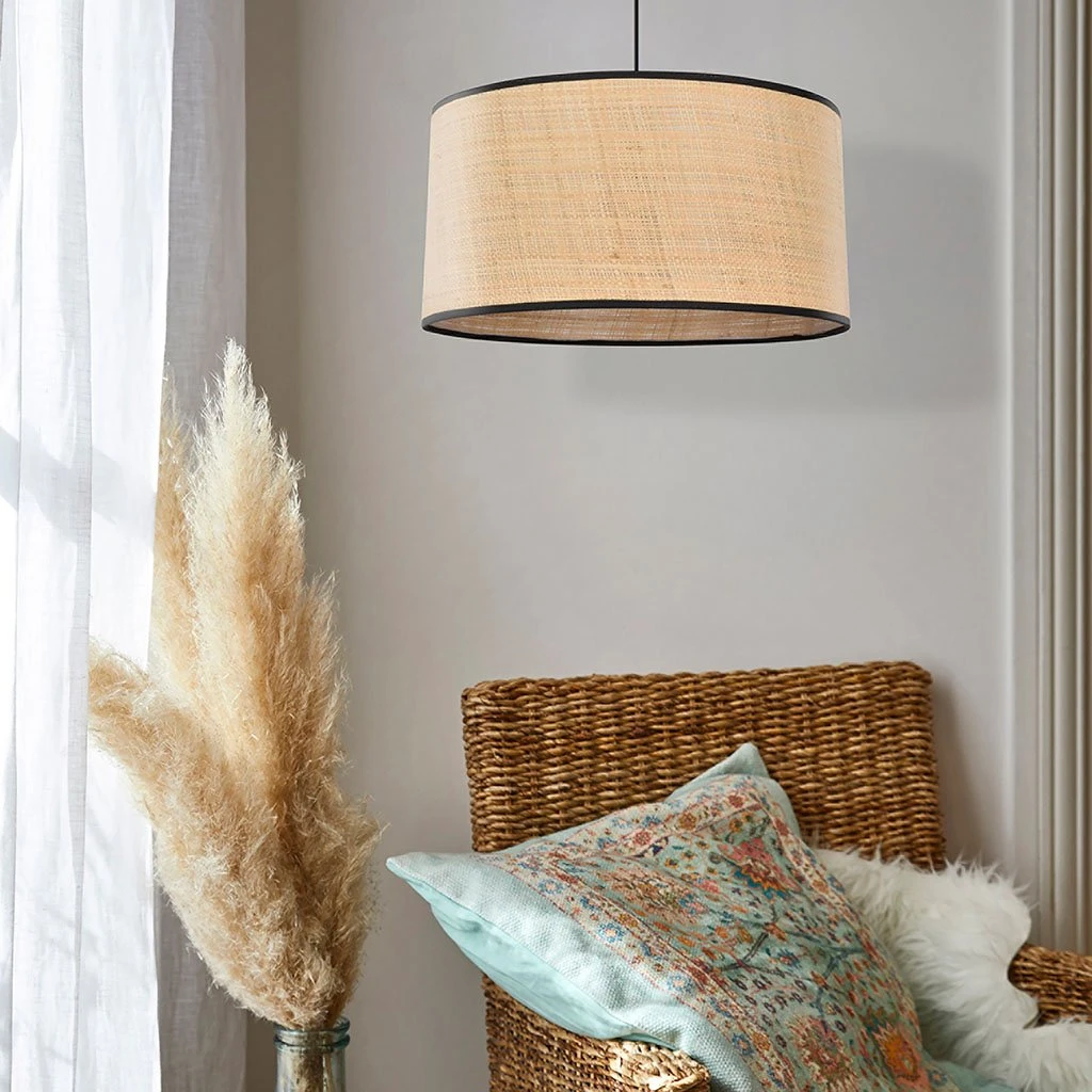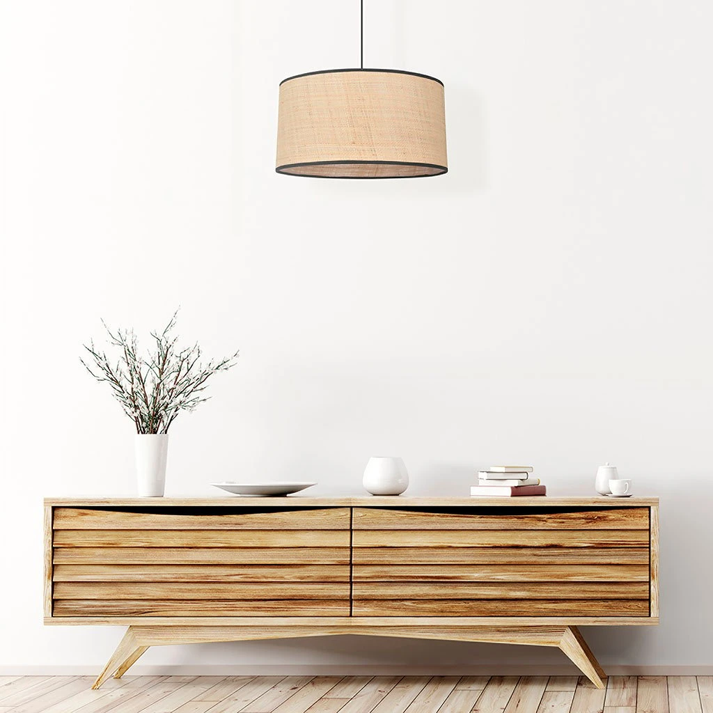 Suspension forme cylindre en matière naturelle, bordée noir.