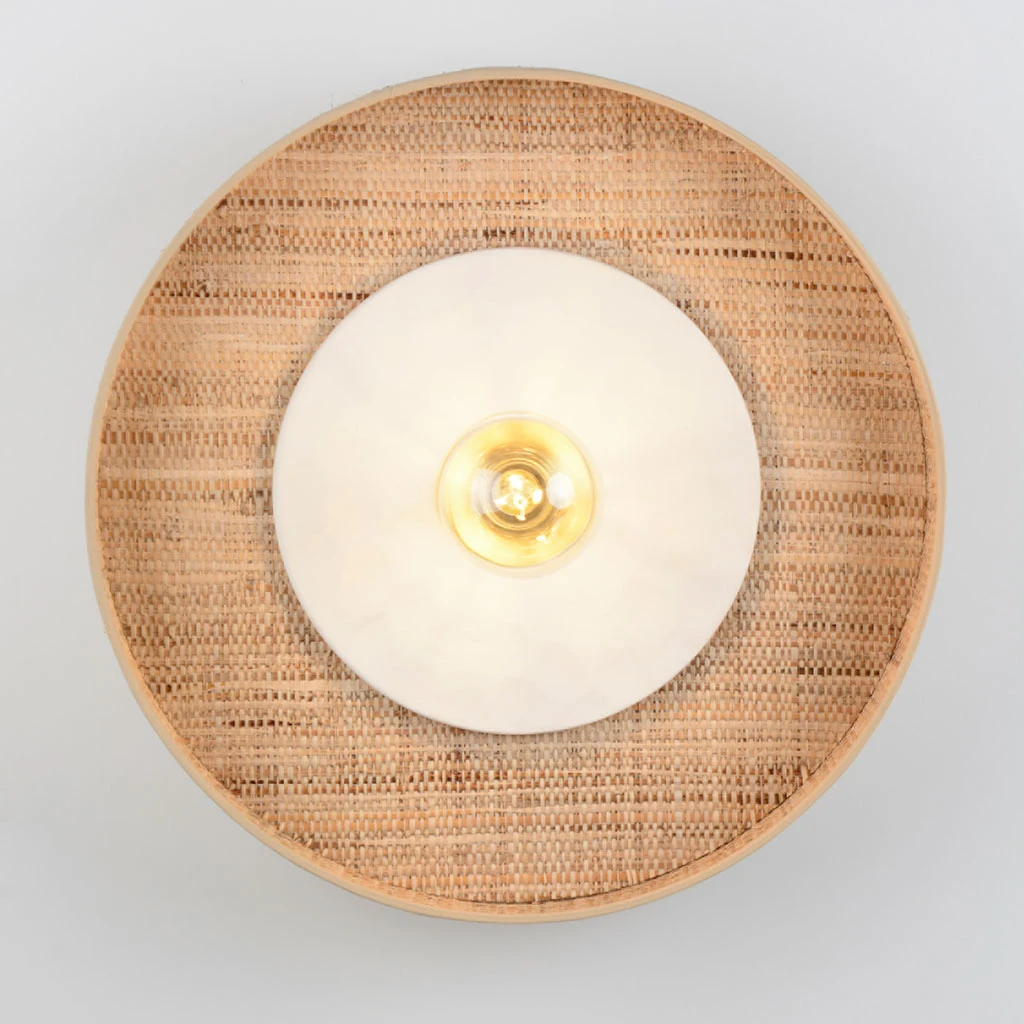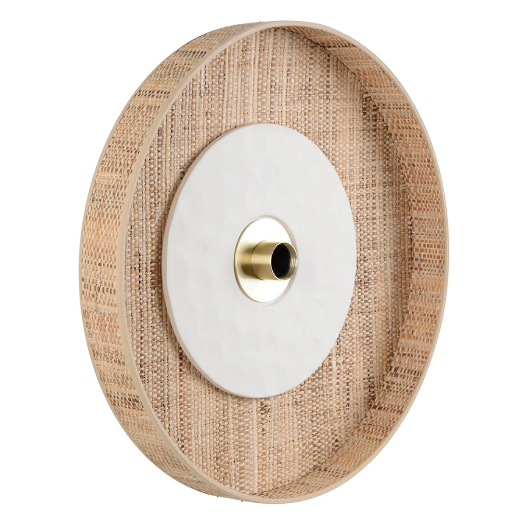Applique forme cylindre en bana, équipé d’un disque en céramique bosselée mat et d’une patère murale en métal adaptable DCL. Coloris : blanc. D50cm – P13cm. IP20. Classe 2. E27-60W.