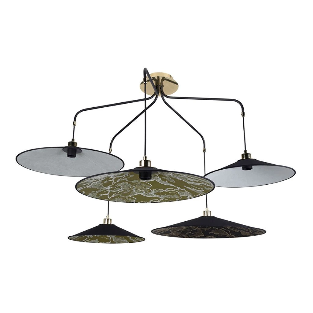 Plafonnier 5 lumières en métal peint finition sablé et détails laiton. Composé de 5 abat-jour de différents Ø, coloris et matières.