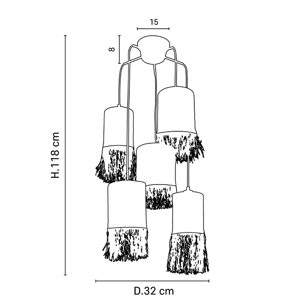 Suspension grappe 5 lumières avec abat-jour cylindre en bana et raphia frangé. Equipée de cordons textiles et d’un pavillon en métal assorti. 5 ampoules E27 40W max non fournies.