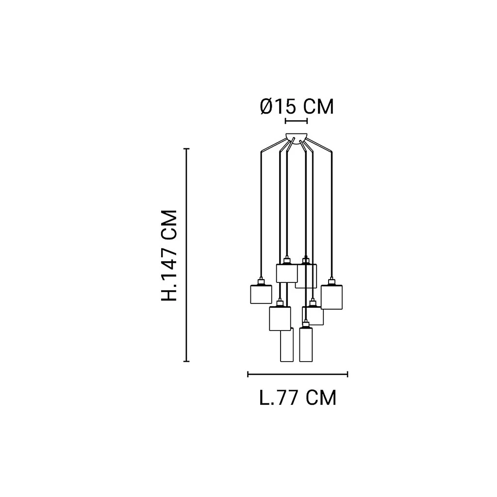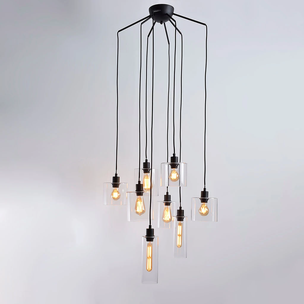 Suspension 8 lumières avec abat-jour cylindres en verre transparent. Équipée de cordelières textiles et d’un pavillon en métal assorti. H147 – D77 cm – 8 ampoules E27/40W non fournies