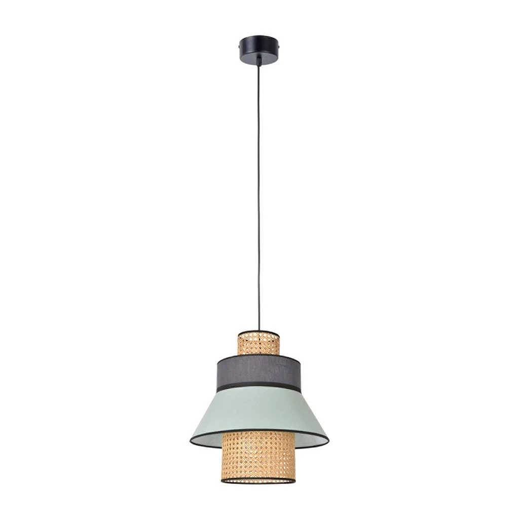 Suspension empilement de 4 abat-jour en lin lavé et cannage, fabriquée en France. Équipée d’un cordon textile et d’un pavillon en métal adaptable DCL.