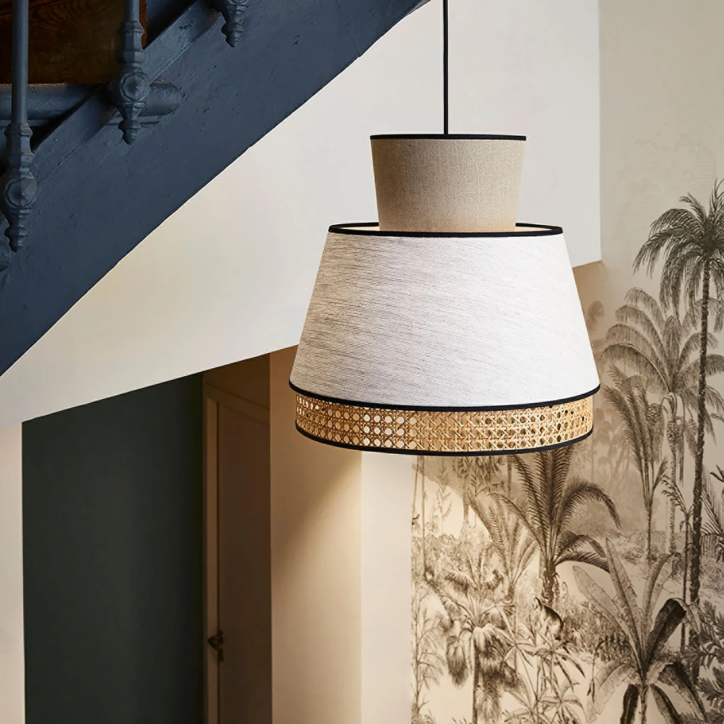 Suspension empilement de 3 abat-jour en lin lavé et cannage. Equipée d’un cordon textile et d’un pavillon en métal adaptable DCL. Ampoule E27 60W max non fournie.