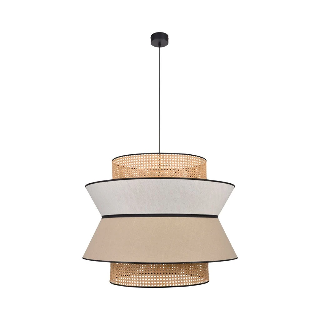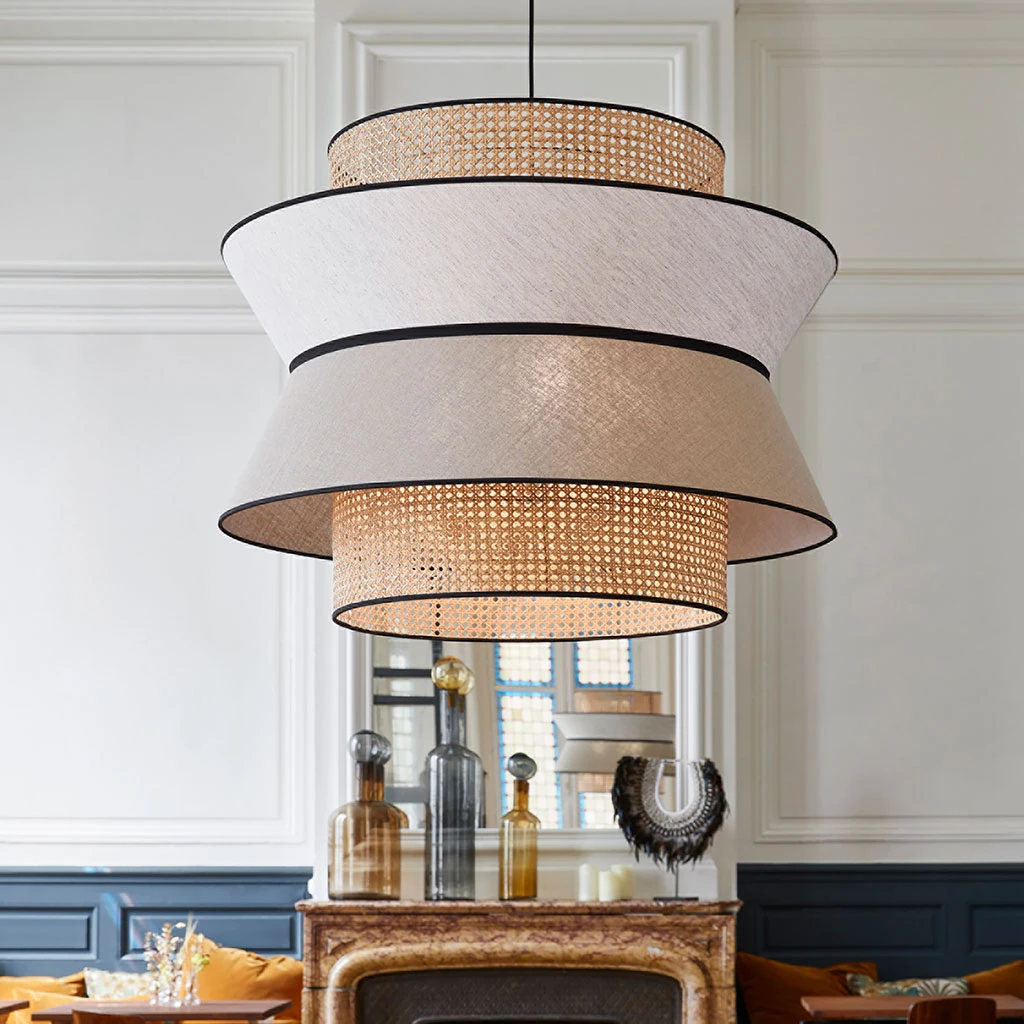 Suspension XXL empilement de 3 abat-jour en lin lavé et cannage. Equipée d’un cordon textile et d’un pavillon en métal adaptable DCL. Ampoule E27 60W max non fournie.