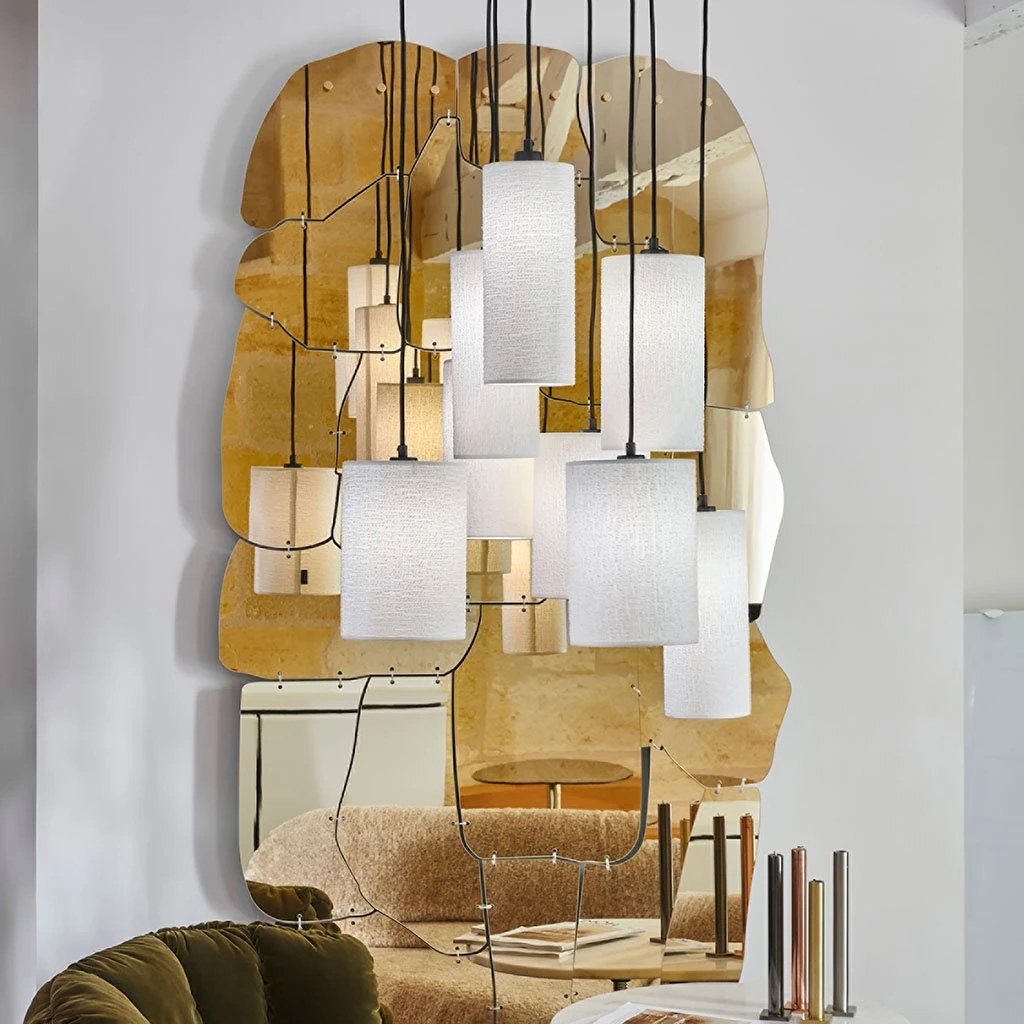 Suspension 8 lumières avec abat-jour cylindres en tissu bouclette. Équipée de cordons textiles et d’un pavillon en métal assorti. Coloris : blanc. IP20. D54cm – H168cm. Classe 2. E27-40W.