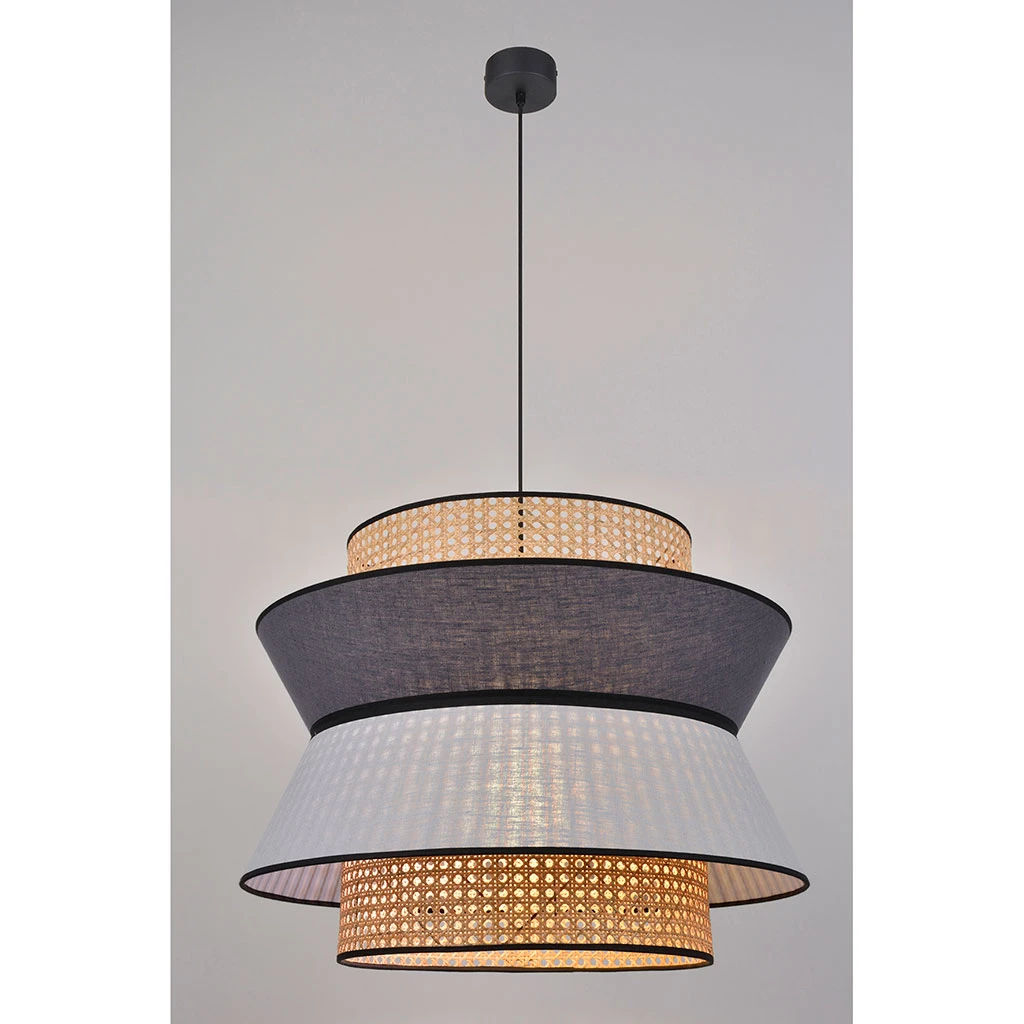 Suspension XL empilement de 3 abat-jour en lin lavé et cannage. Equipée d’un cordon textile et d’un pavillon en métal adaptable DCL.